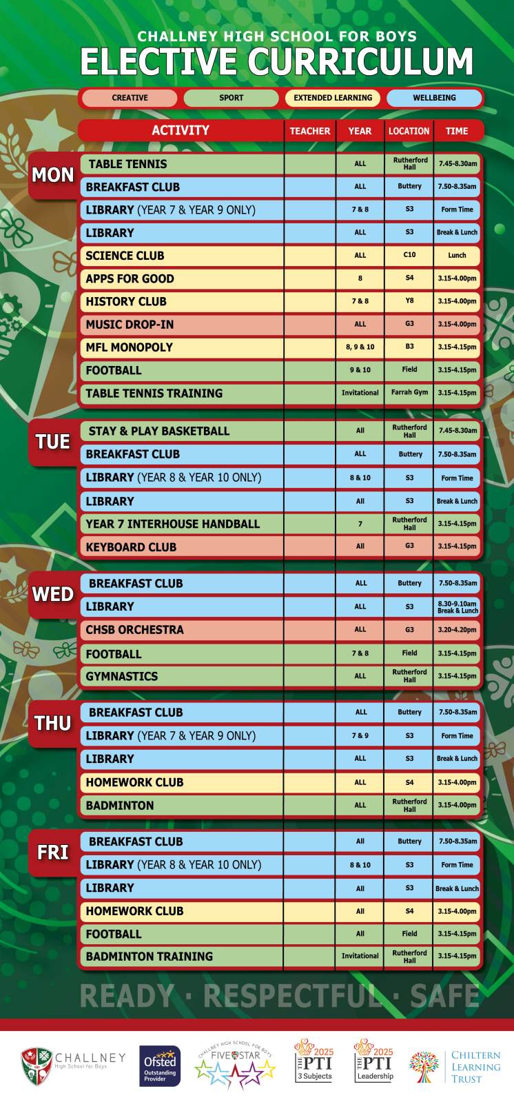 Our elective curriculum programme has been extensively produced to ensure students are entitled to a range of academic and sport-related activities before school, during lunch and after school.
